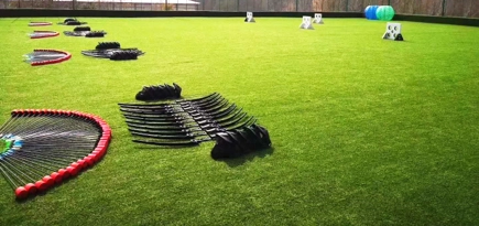 在大约一个篮球场大小的草地或平地开展(场地根据具体人数来定),两队分别在场地的两个半场对战,半场中间有3m宽的安全地带,双方不可跨越半场作战,也不可跨越出本队的作战区域,安全区域之后有三个充气掩体和六个救人箭靶,每队的后场还有一个绝杀箭靶。(人数多可以适量增加掩体以及箭靶数量)